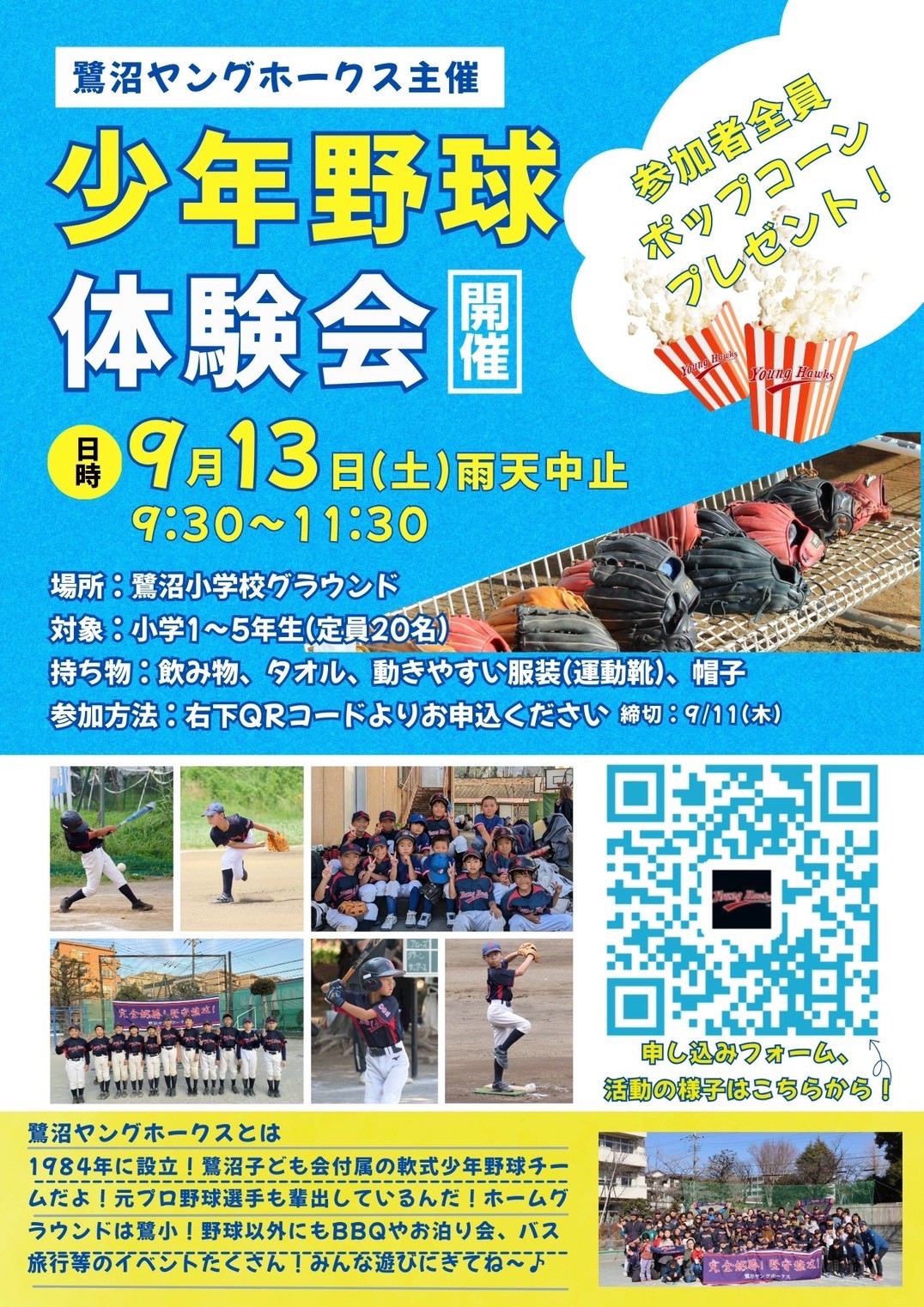 鷺沼子ども会野球部 鷺沼ヤングホークス体験会開催のお知らせ:9/13(土)